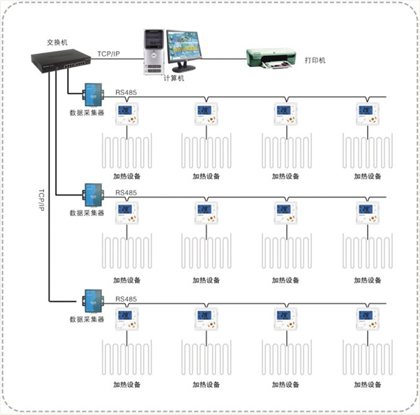 軟件系統(tǒng)與采集器的通訊標(biāo)準(zhǔn)為TCP/IP通訊方式。采集器與采暖智能溫度控制器的通訊采用平衡傳輸?shù)腞S485串行總線通訊標(biāo)準(zhǔn),通訊距離遠(yuǎn),抗干擾能力強。 其中,每—臺電采暖智能溫度控制器獨立完成電伴熱設(shè)備的各種狀態(tài)的數(shù)據(jù)采集和控制任務(wù)。上位機軟件系統(tǒng)以周期詢問的方式與數(shù)據(jù)采集器實現(xiàn)穩(wěn)定的網(wǎng)絡(luò)通訊,數(shù)據(jù)采集器將采集到智能溫度控制器的狀態(tài)上傳至上位機管理中心。上位機軟件系統(tǒng)又將采集到智能溫度控制器的實時狀態(tài)進(jìn)行邏輯分析,并將 佳控制結(jié)果通過信號控制發(fā)送至智能溫度控制器, 終實現(xiàn)自動化控制。